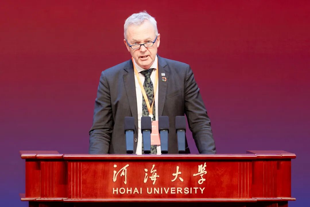 代尔夫特水教育学院校长Eddy Moors作为国外高校代表致辞。他表示,河海大学作为中国最早专注于水利领域的高等学府之一,为中国江河湖泊与河口三角洲可持续发展作出深远贡献,有力推动全球水科学进步。荷兰与中国同为依水而生的国度,正因都秉持着团结合作精神,河海大学与荷兰高校之间的合作,得以跨越时光、结出硕果。在共庆河海大学百十辉煌成就之际,希望两校携手持续推动水科学创新发展,培育未来水利领域的领军人才,共建一个更具韧性、可持续发展的地球家园。