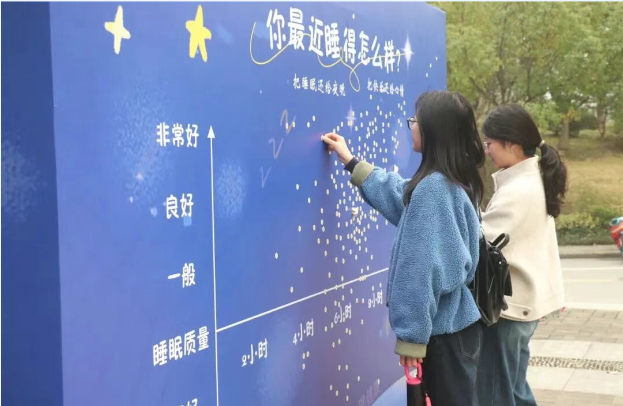 在互动展板前,同学们用星星贴纸标记自己的睡眠状态。错落有致的星星贴纸共同构成了一幅生动的校园睡眠图谱。简单的互动引发了不少同学的共鸣,大家在彼此的选择中看见自己,也在无形中开启对睡眠质量的关注。
