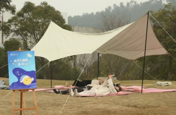 在江宁校区叠翠山顶,一方静谧的轻睡眠空间悄然铺开。遮阳天幕下,瑜伽垫与抱枕错落有致。同学们或闭目静卧,享受春日暖阳与微风;或在志愿者引导下练习腹式呼吸、渐进式肌肉放松。山顶的鸟鸣与远处的喧嚣隔绝,短短20分钟的“轻睡眠”体验,却为身心注入满满元气。