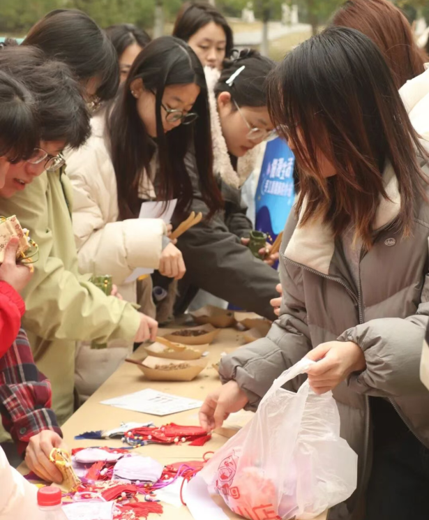 呼应春分时节的草木萌发,手工体验区飘散着沁人心脾的草药香。同学们亲手挑选薰衣草、百合花、酸枣仁等安神药材,悉心装袋,缝制出独一无二的助眠香囊。展区负责人表示:同学们制作香囊的热情很高,原先准备的香囊很快供不应求!