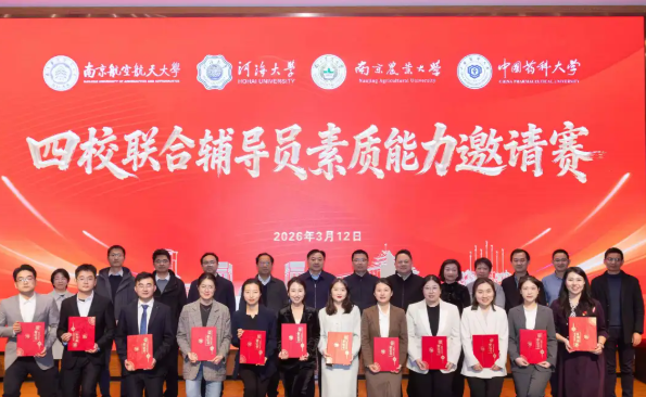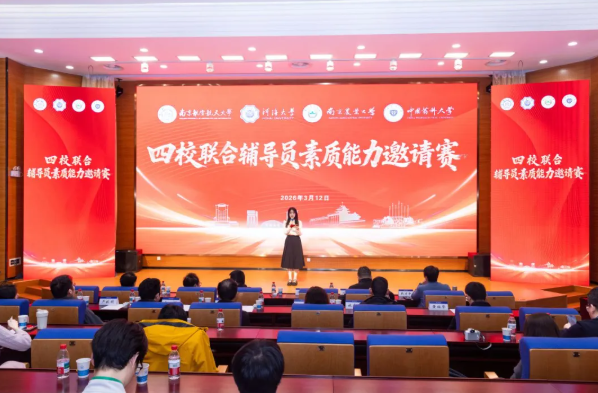 为深入学习贯彻习近平新时代中国特色社会主义思想,扎实落实高校立德树人根本任务,努力把辅导员队伍建设成为全学段思政教育的主力军、全场域服务成长的引路人、全链条人才培养的助推者, 2026年3月12日,南京航空航天大学、河海大学、南京农业大学、中国药科大学四校的学工队伍相聚在百十年梧桐掩映的河海大学西康路校区,共同见证这场以赛带练、以练促学、以学强能的育人盛会。来自四所高校的12名优秀辅导员在此次邀请赛中展开同台竞技、亮剑争锋,用实力说话,以情怀动人。