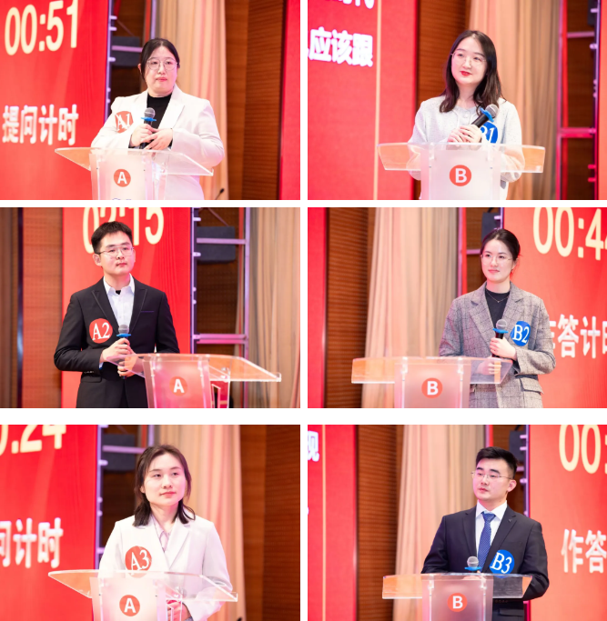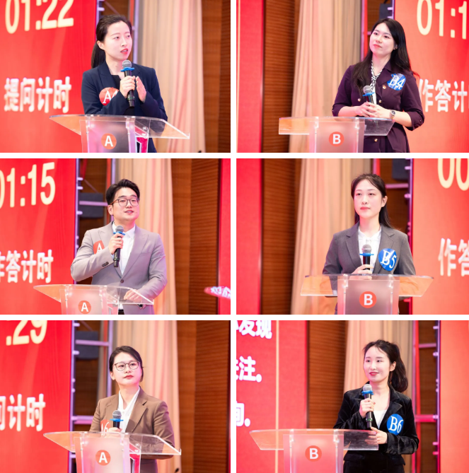下午1点30分,现场展示环节正式拉开帷幕。首先进行的是思辨碰撞的案例研讨环节。该环节采用 AB 角互动比拼模式,12名选手赛前抽取签位及上场顺序,以“我提问,你回答”的形式展开角逐,在2分钟精准提问、5分钟专业作答的限时挑战中,六组选手围绕学生思想价值引领、学风建设、心理健康、生涯规划等典型案例,条分缕析提出解决方案,高屋建瓴总结工作规律,在互学互鉴中碰撞出的育人智慧火花。